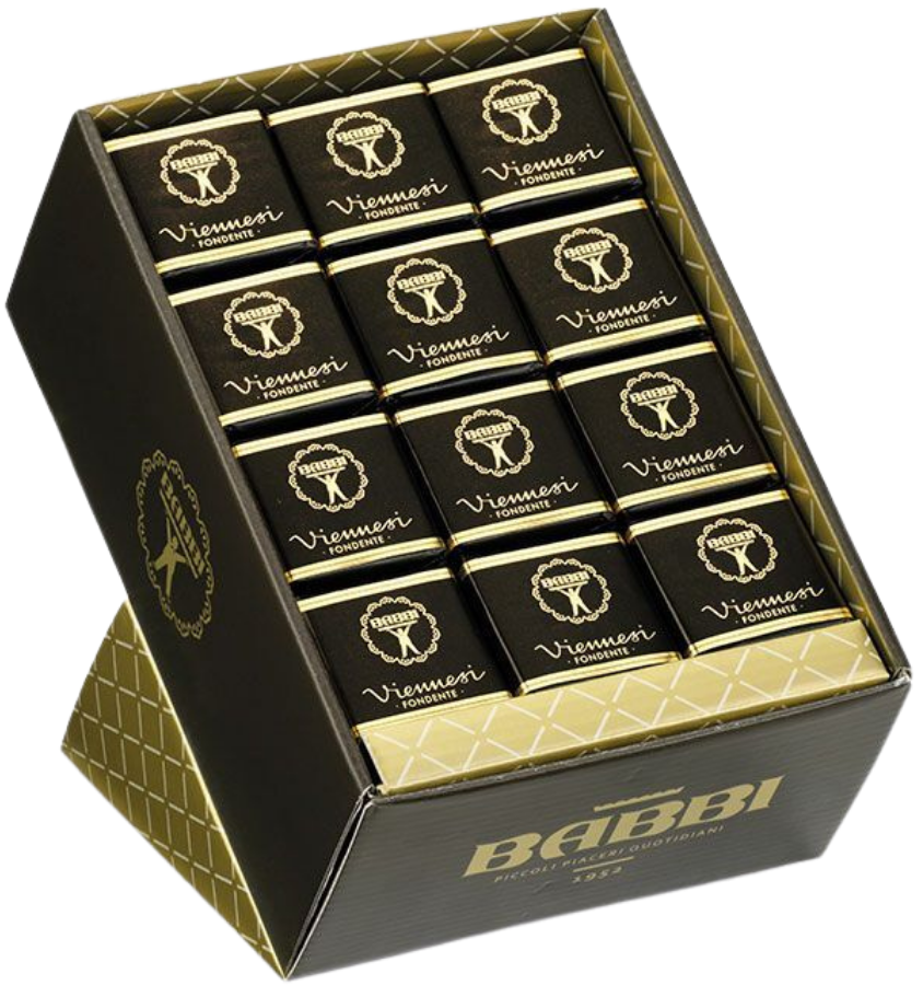 Depuis 1952, Babbi est synonyme de spécialités italiennes raffinées à base de gaufrettes et de chocolat. Avec ses 1200 g de Viennesi Fondente, le présentoir est la solution idéale pour la vente, les événements ou comme attention particulière pour vos invités – un véritable accroche-regard sur n'importe quel comptoir.